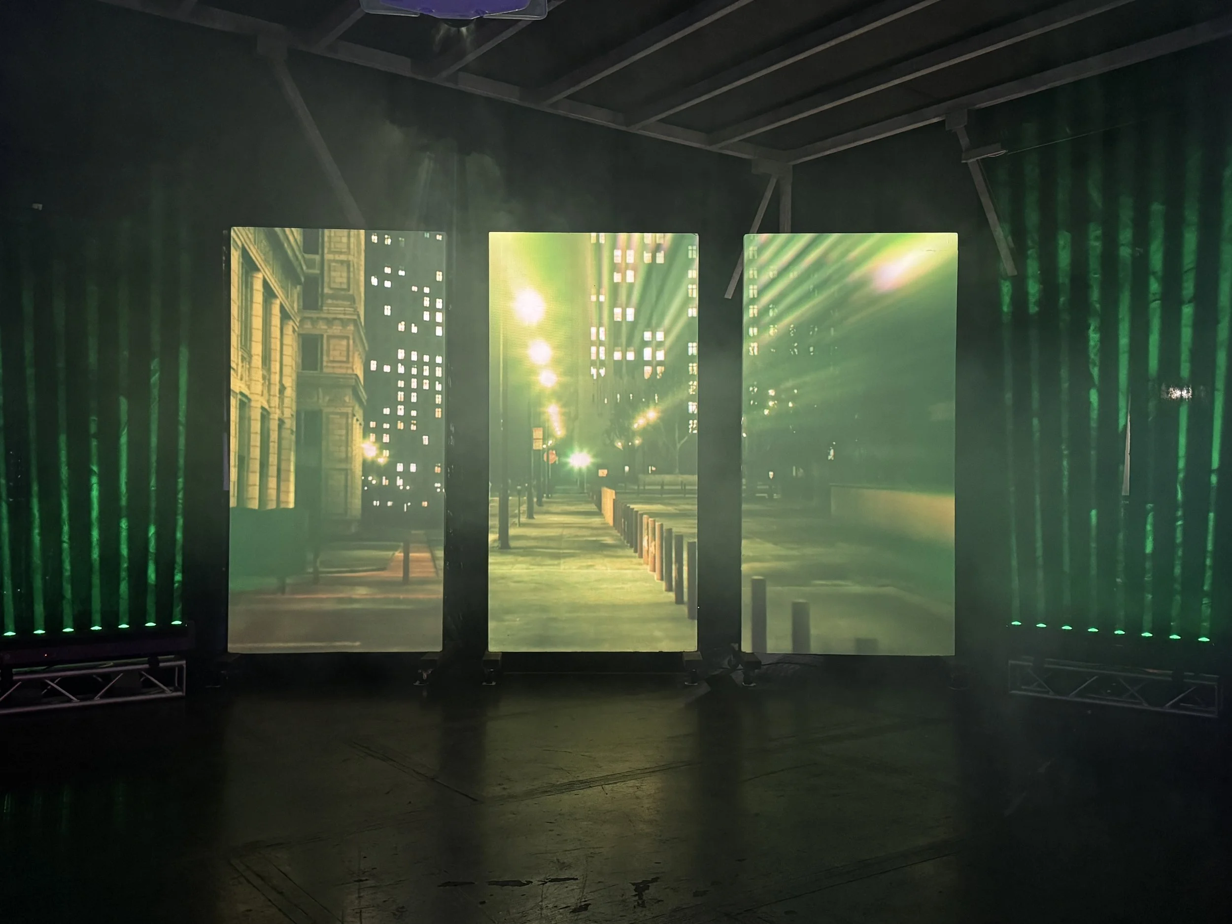 Visuals are projected as a triptych across three panels, accompanied by stage lighting all edited and programmed in sync with the soundtrack. The experience runs for 10 minutes, immersing viewers in a rhythmic journey through the city's nocturnal life.