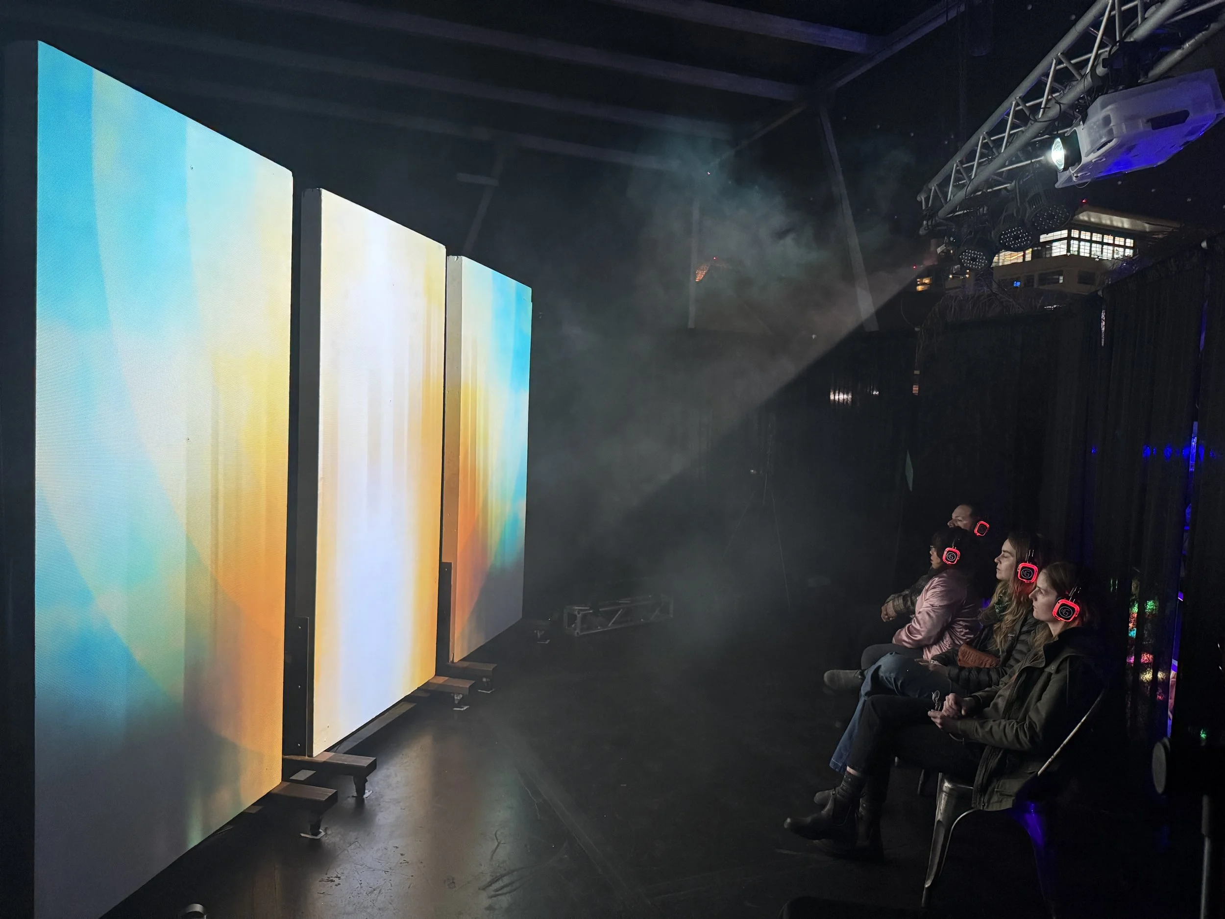 The resulting installation was then experienced through 'silent disco' style headphones which were synced up across listeners, allowing for the audience to watch, listen, dance and experience together.