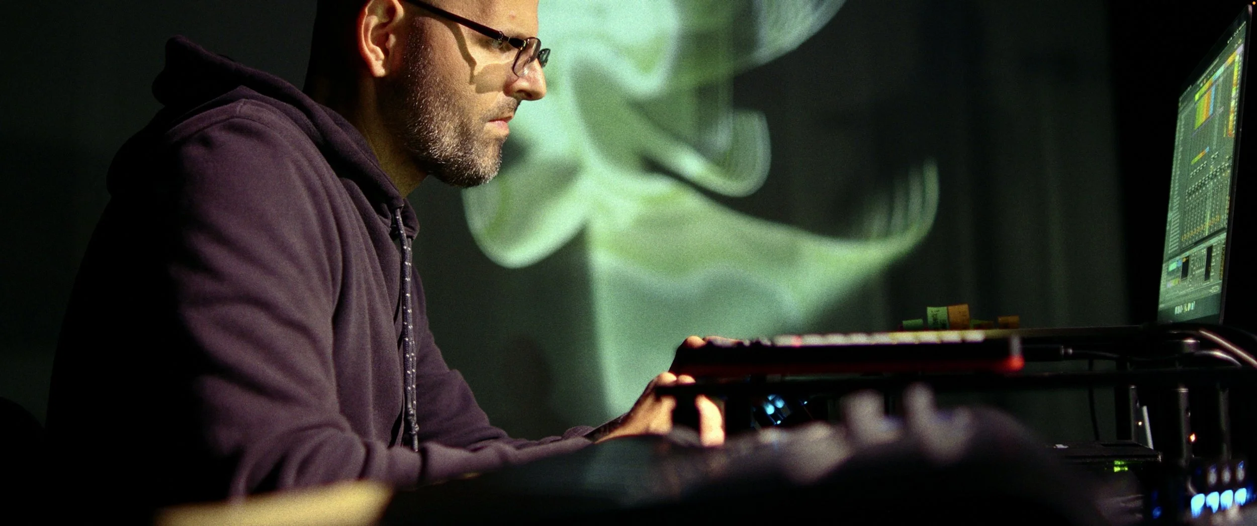 Performance: This performance debuted on April 17, 2025 at UC-San Diego’s Experimental Theater. It was performed using a 32-channel soundsystem and full back wall projection screen. Real-time audio from vocal, acoustic and electronic elements were used to generate spatial and visual components of the performance. Conversely, visual projections informed performative aspects of the electronic music elements. With the goal of creating a truly dynamic and immersive experience, all multimodal aspects of this performance directly influenced the others in real-time.